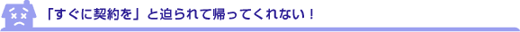 見積に来て貰ったら「今、契約してくれれば値引きします」「いまここで契約してください」などと言われることがあります。でも、それでは合い見積もりの意味がありません。よほど信頼できると思えない限り、きちんと「検討して後日返事します」と答えるのがいいでしょう。それでも強行に契約を迫られたら、もうはっきりと断ってしまいましょう。こういう業者は契約内容をきちんと説明しないことも多いはず。後々のトラブルの元です。はっきりと「帰って欲しい」と告げ、それでも帰ってくれなければ警察に電話を!